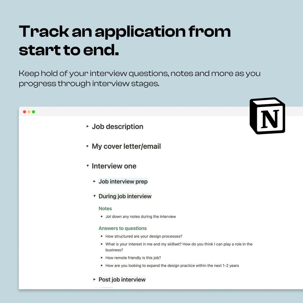Notion Template containing Job Application Tracker, Interview Planner, Organiser for interview questions and notes as well as a database to store your CVs and Cover letters. Use this to stay organised during your job search and minimise your stress levels with this all-in-one tracker.